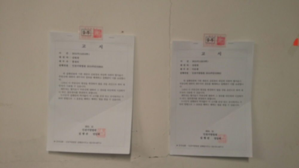 임대목적물 내부 벽면에 점유이전금지가처분 고시문 부착 사진 / 집행관의 가처분 집행 페이지 정보 작성자 (220.♡.167.96) 작성일18-03-29 18:50 조회4,376회 댓글0건 관련링크 이전글 다음글 목록 본문 임차인 1명, 무단전차인 1명을 상대로 점유이전금지가처분신청을 하고 결정을 받아 집행관으로 하여금 가처분집행을 실시함집행관은 집행목적물 내부에 "점유를 타인에게 이전하지 말라'는 취지의 고시문을 내부벽면에 부착함,채무자가 2명이므로, 각 1부 씩 부착하였음 댓글목록 등록된 댓글이 없습니다. 이전글 다음글 목록