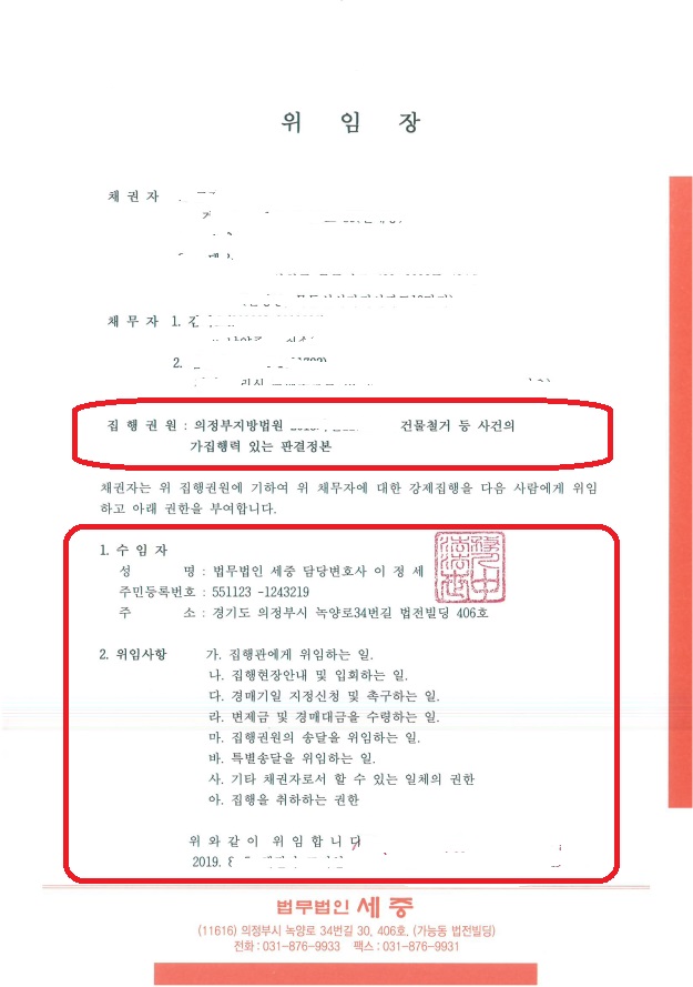 건물철거 인도집행 위임장(대리인 법무법인 세중) 페이지 정보 작성자 (14.♡.133.23) 작성일20-04-29 17:23 조회3,532회 댓글0건 관련링크 이전글 다음글 목록 본문 임대인 스스로 건물철거 및 토지인도 소송을 제기하여 판결을 받은 후본 법무법인에 건물철거 및 토지인도 강제집행 사건을 의뢰한 사례집행신청시 첨부하는 본 법무법인의 강제집행 위임장 댓글목록 등록된 댓글이 없습니다. 이전글 다음글 목록